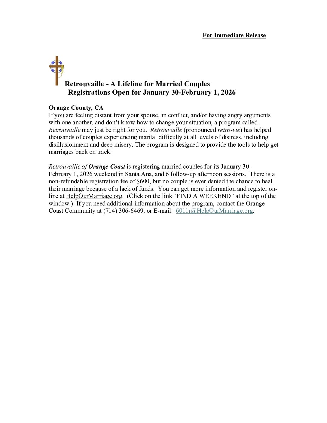 Retrouvaille Weekend January 30-February 1, 2026 – Retreat weekend