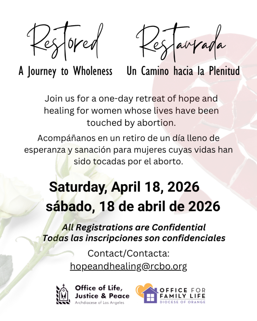 Acompáñanos en un retiro de un día lleno de esperanza y sanación para mujeres cuyas vidas han sido tocadas por el aborto. Este retiro es gratuito gracias a nuestros generosos benefactores.